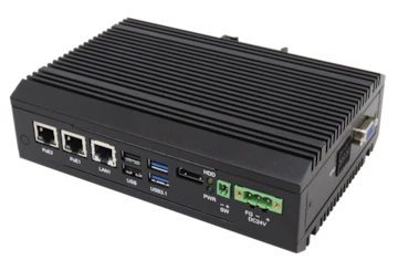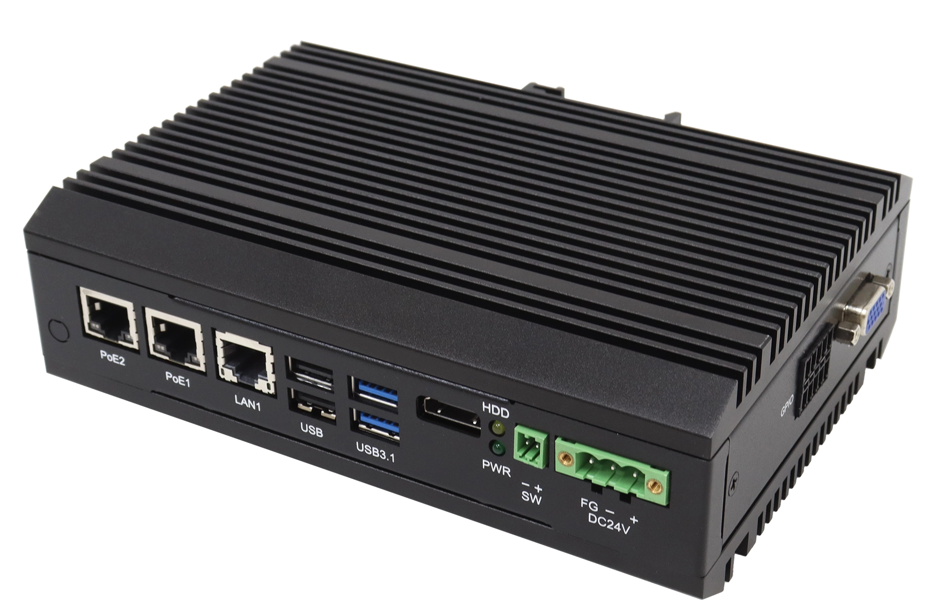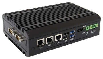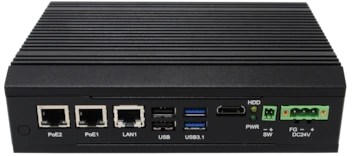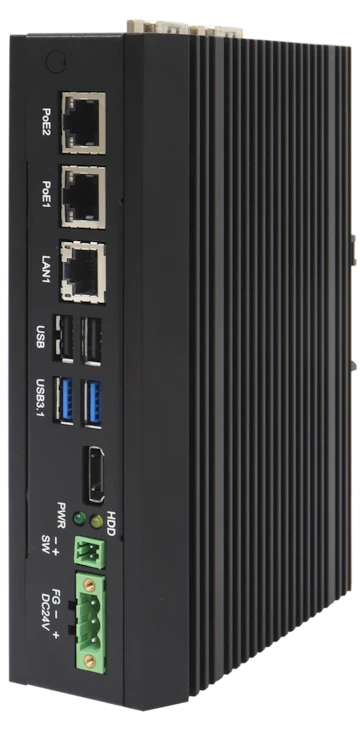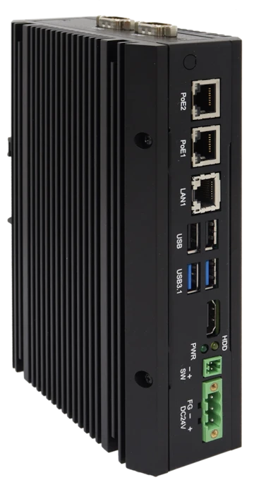 Compacte Machine Vision Box PC met Intel J6412 Elkhart Lake Processor. Het systeem beschikt over een geheugencapaciteit van 32GB, 2 x PoE poort, een HDMI en VGA display aansluiting, 4 USB poorten en 2 COM poorten.