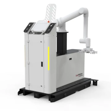 The EasyRobotics palletizer consists of a main console with an interior compartment for storing the robot controller, cables, hosts and either a lift module or a base. There is a pallet docking system on each side of the product, which can measure the correct position of the pallet and inform when the pallet is incorrectly positioned. The system also has extended "legs" that can be extended to work with larger cobots.