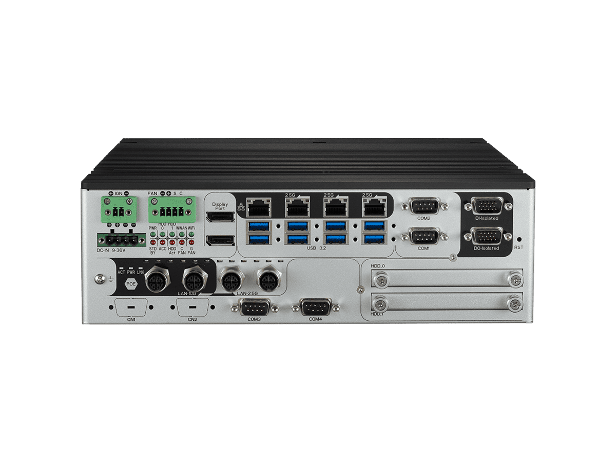 Intel® 14th Gen. CoreTM LGA1700 Processor, R680E Chipset 4*COM, 8*USB 3.0, 4*GbE, 4*RJ45 POE(2*2.5GbE/2*10GbE), 16bit DIO DC 9~36V, Power Ignition, Emark. Support 60W GPU MXM(NVIDIA A2000) module expansion