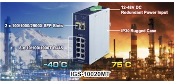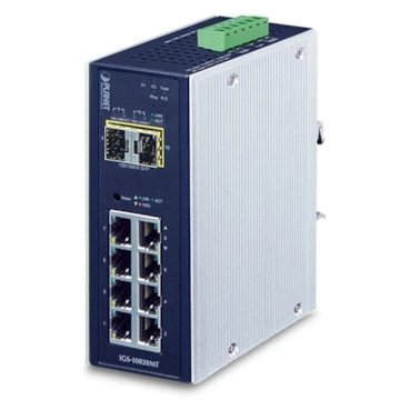 PLANET IGS-10020MT is a fully-managed Gigabit fiber switch usually designed for the industrial network. It features 8 10/100/1000BASE-T copper ports, 2 100/1000/2500BASE-X SFP ports and redundant power system in an IP30 rugged but compact-sized case that can be installed in any difficult environment without space limitation. Within such favorable enclosure, it provides user-friendly yet advanced IPv6/IPv4 management interfaces, abundant L2/L4 switching functions and Layer 3 static routing capability. The IGS-10020MT can operate stably under the temperature range from -40 to 75 degrees C and allows either DIN-rail or wall mounting for efficient use of cabinet space. With 2 100/1000/2500BASE-X SFP fiber slots, it can be flexibly applied to extend the connection distance.