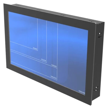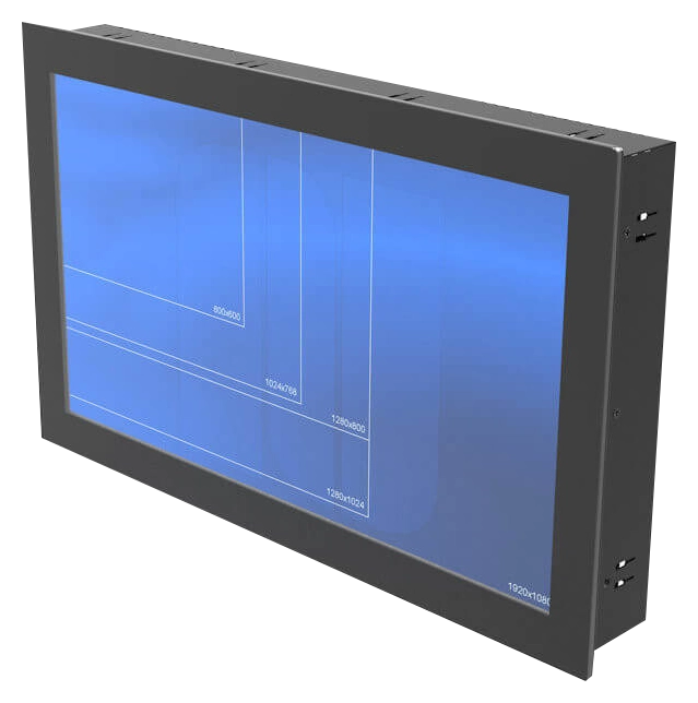 18.5" industrieel widescreen Panel Mount TFT display met glas, maximale resolutie van 1920X1080 en 1 x HDMI + 1 x VGA + 1 x DVI-D + composite video output. Optioneel uit te rusten met Projected Capacitive touchscreen, external dimming, High Bright LED 1000 display, wide range 9~36V power input en Optical Bonding.