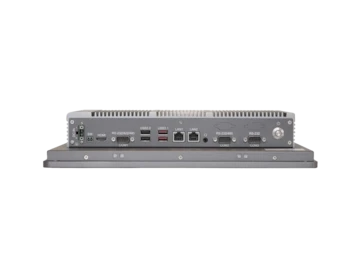 15’’ 1024x768 (4:3) fanless HMI barebone with Intel Celeron J6412 (2.0 GHz), 1x DDR4 slot up to 32GB, 1x M.2 2242 SSD slot, Resistive touch screen, DC 12~36V input, 3x COM, 4x USB, 2x LAN, 1x HDMI, IP66 front panel, Aluminium chassis